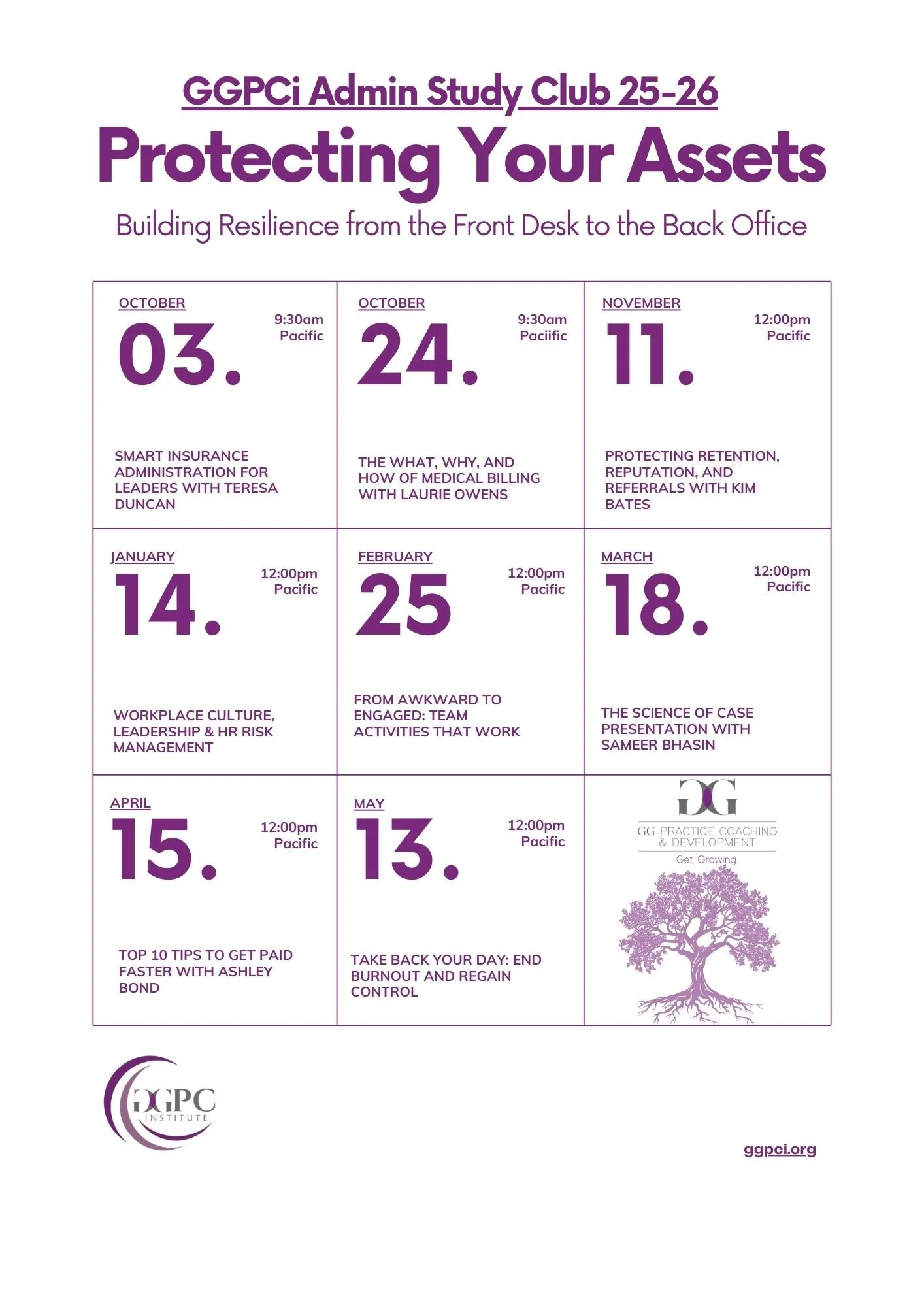This year, the GGPCi Admin Study Club theme — Protecting Your Assets — is built with you in mind. We’ve gathered top experts to share practical tools and strategies that will strengthen your systems, support your team, and safeguard your practice’s most valuable resources — from the front desk to the operatory. You’ll leave each session with actionable ideas you can implement right away to reduce risk, boost efficiency, and set your practice up for long-term